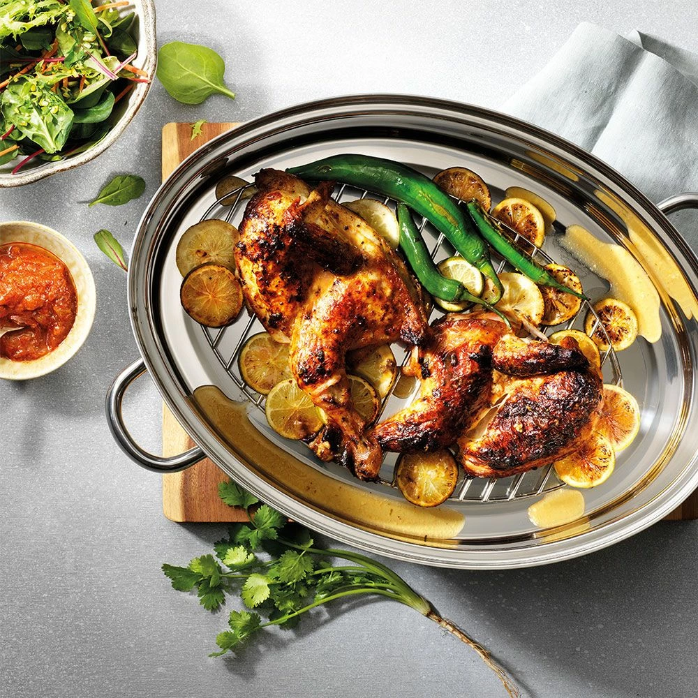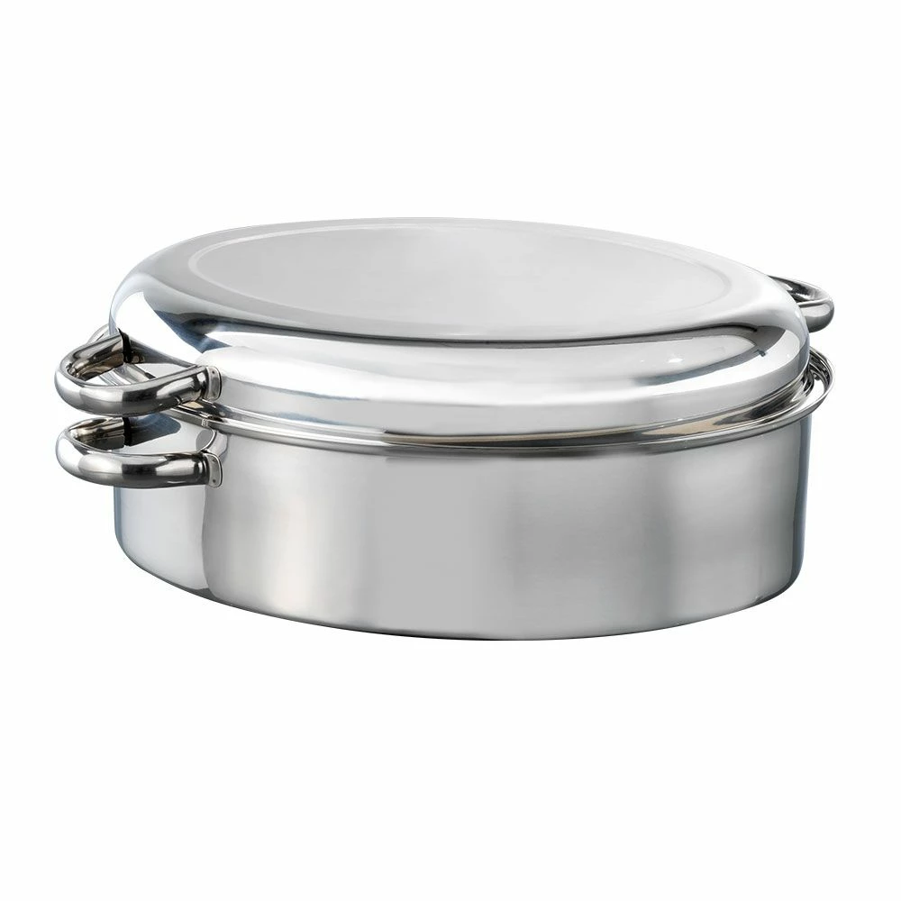 1 x Oval Roasting Dish, 1 x Oval Roasting Lid, 1 x Stainless Steel Steaming Rack