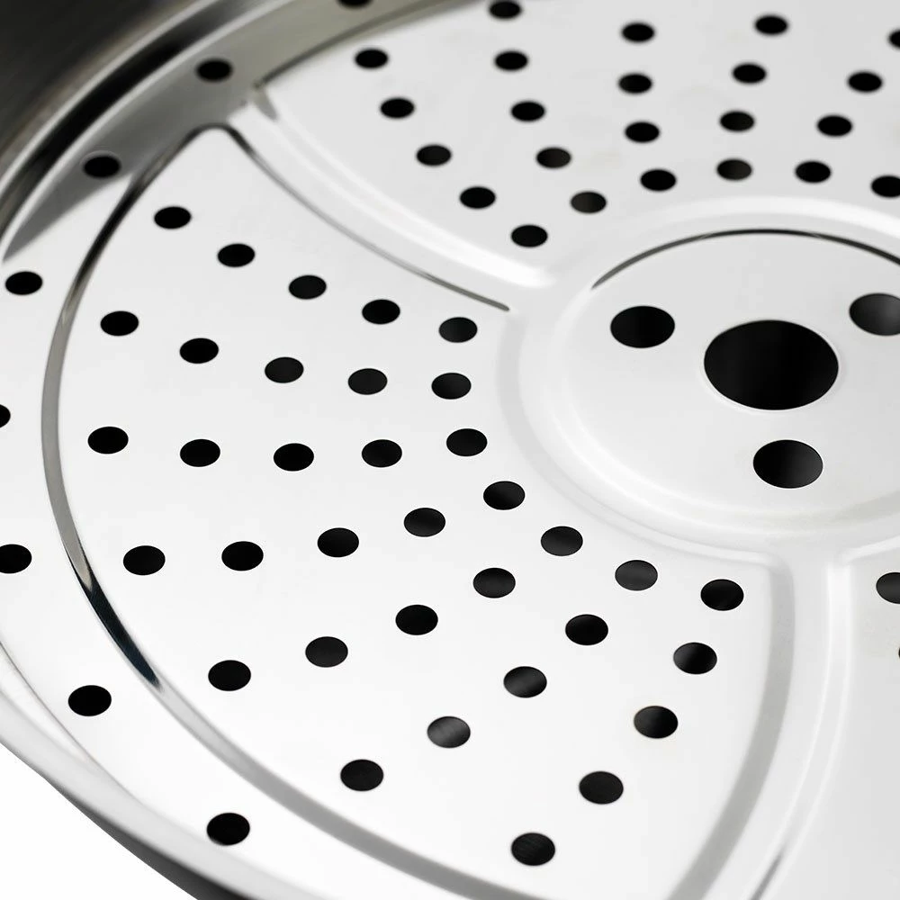 - Stainless steel steamer insert and lid, perfect for dumplings, wontons and vegetables. The holes allow maximum steam to circulate around and over the food