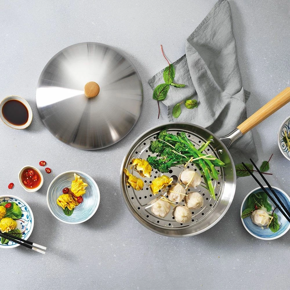 - Domed stainless steel lid serves not only to keep in the steam for perfect Asian inspired dishes but also to recirculate juices when casseroling.
