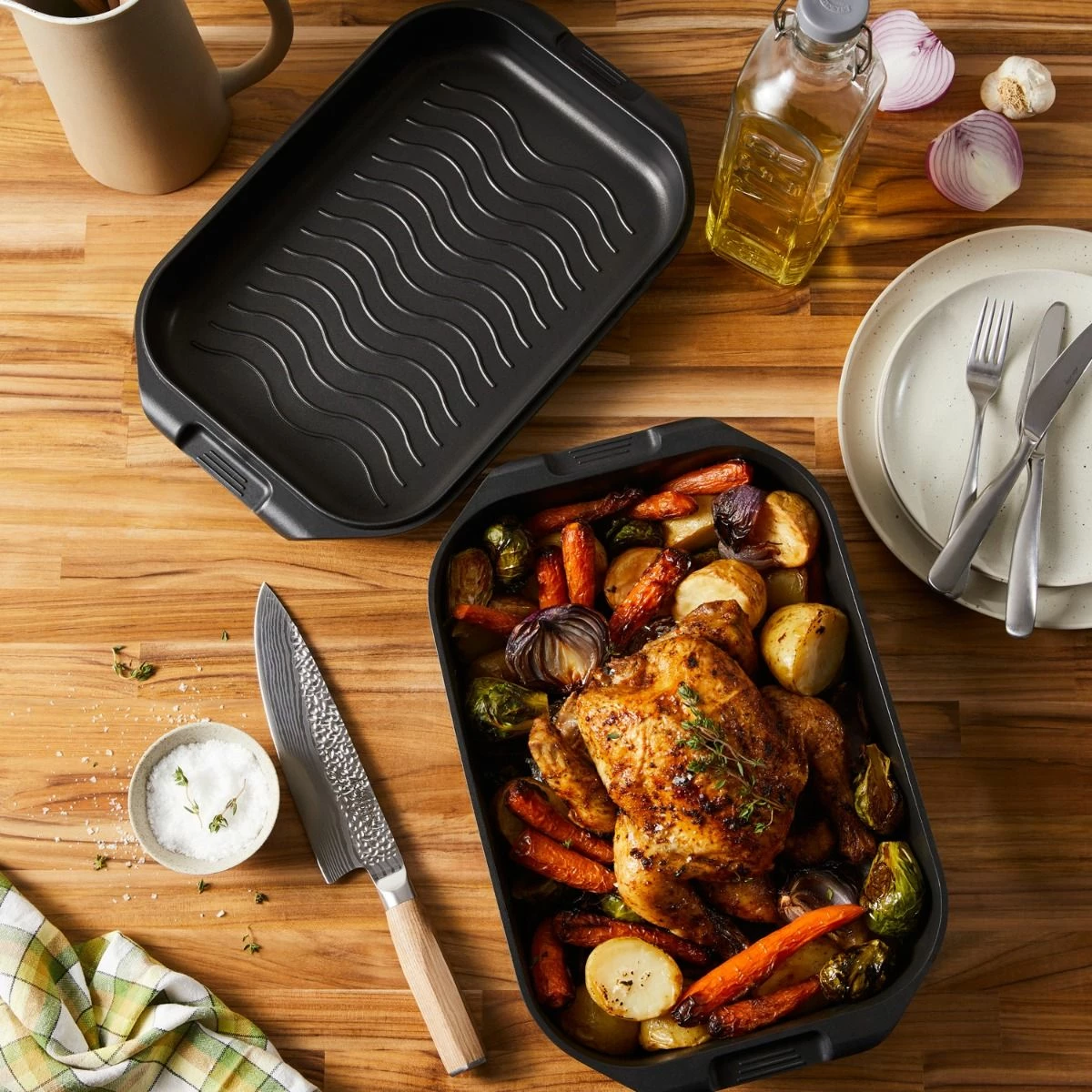 Get creative in the kitchen and whip up a variety of delicious meals for your friends and family using the wonderfully versatile Baccarat iD3 Roast & Grill Multi Pan! This 2-piece cookware item is a must-have for every kitchen – with parts designed to be used independently or together, the Baccarat iD3 Roast & Grill Pan can be used for grilling, frying, baking, and roasting hearty and healthy meats, fish, produce and veggies. With fully bonded induction plates and a durable lid that features raised ridges to create perfect grill lines on steaks and salmons, and the deep roast pan for cooking that perfect Sunday roast dinner, the Baccarat iD3 Roast & Grill Multi Pan is suitable for using in the oven up to 220-degrees Celsius or on electric, gas, ceramic, halogen and induction stove and grill tops.