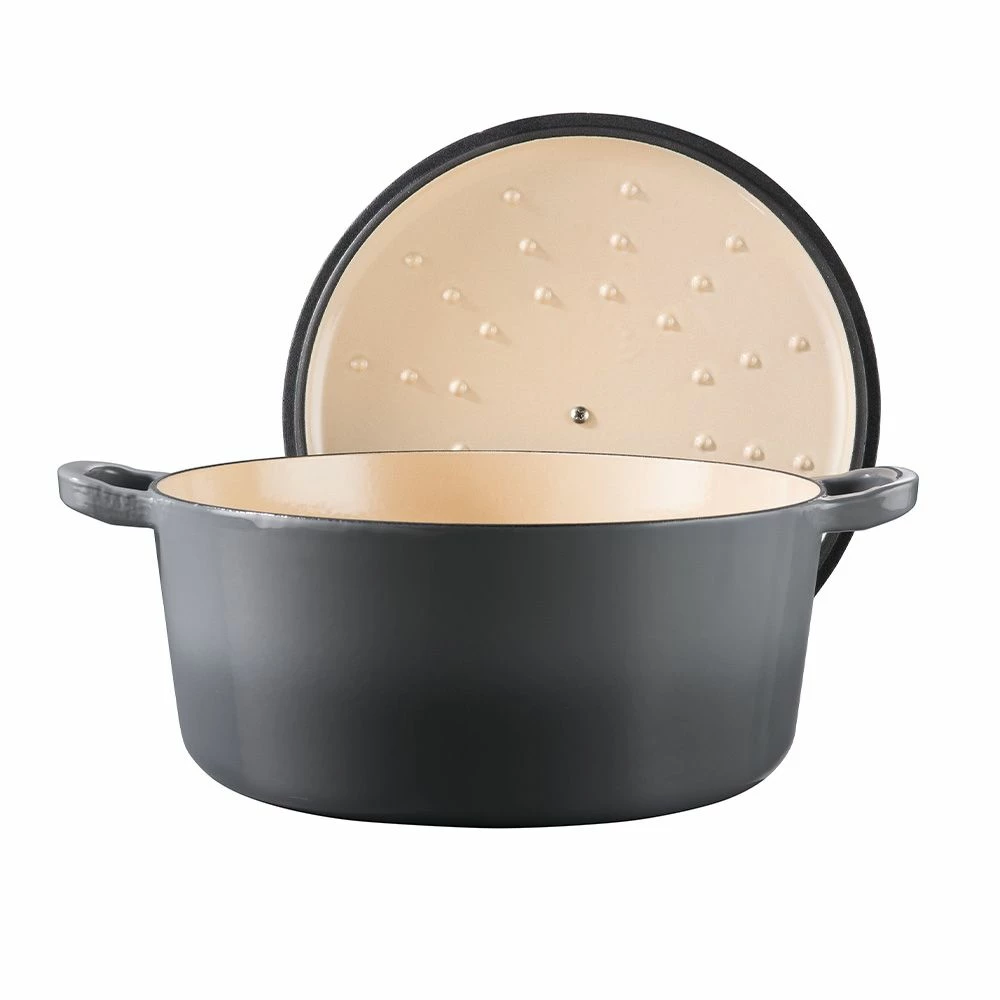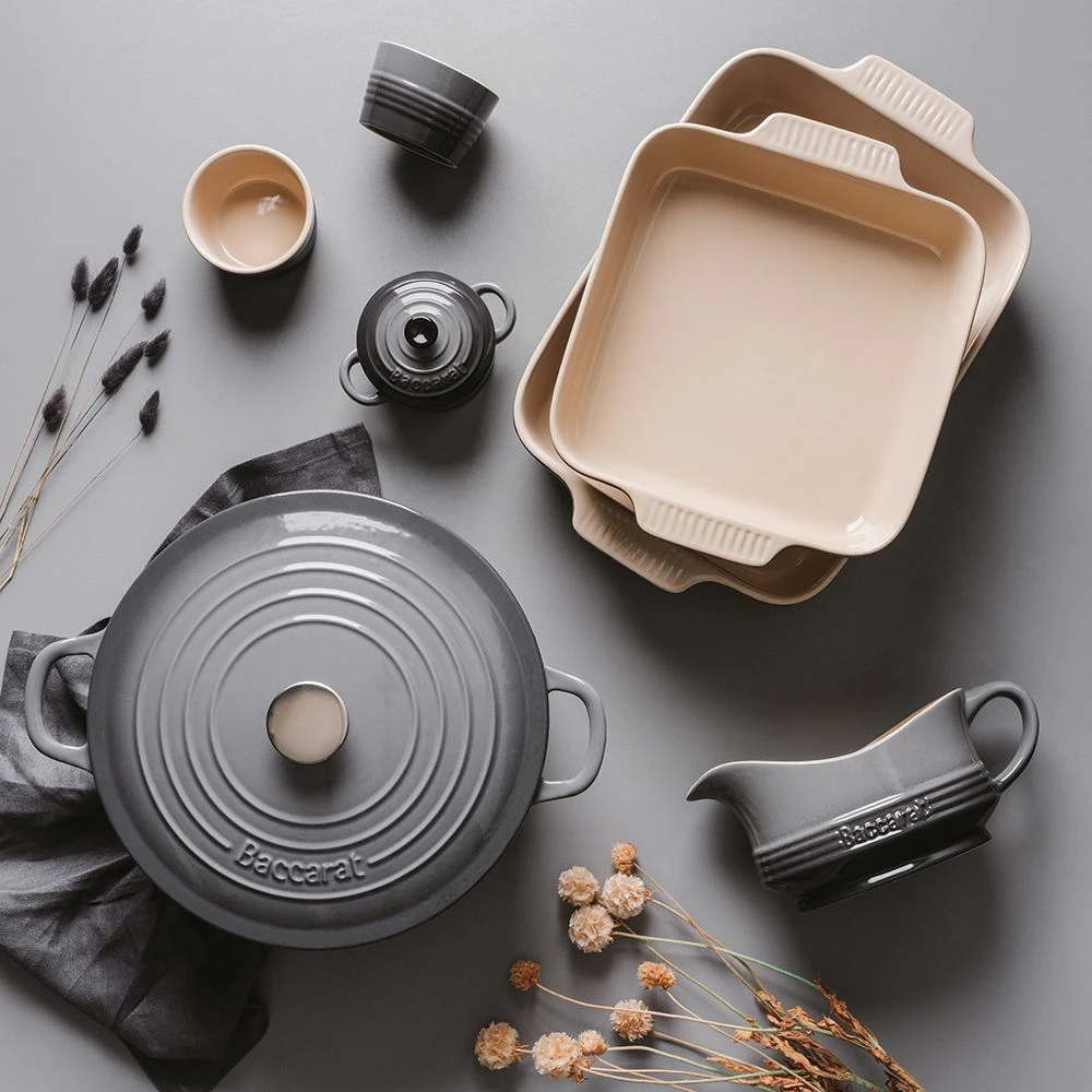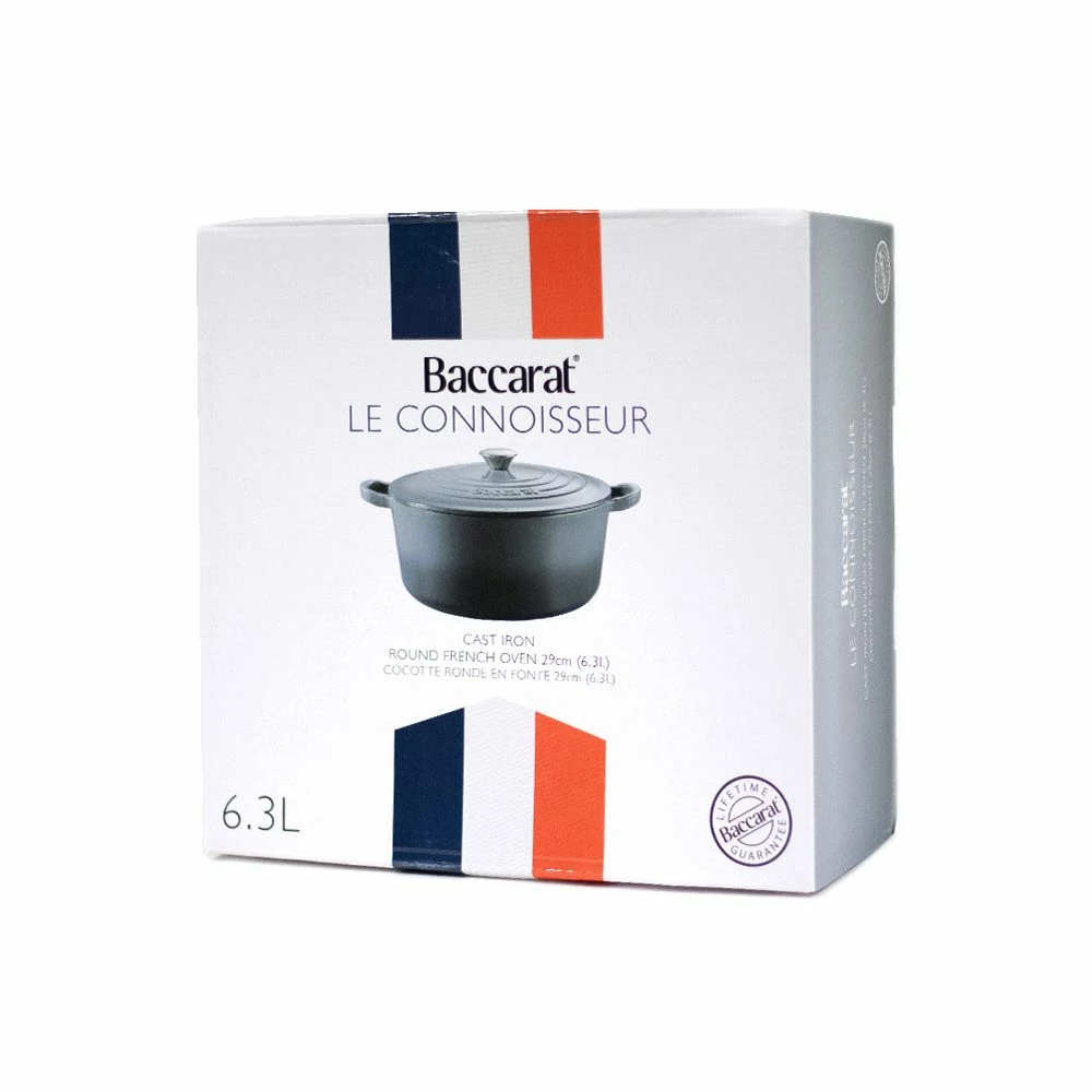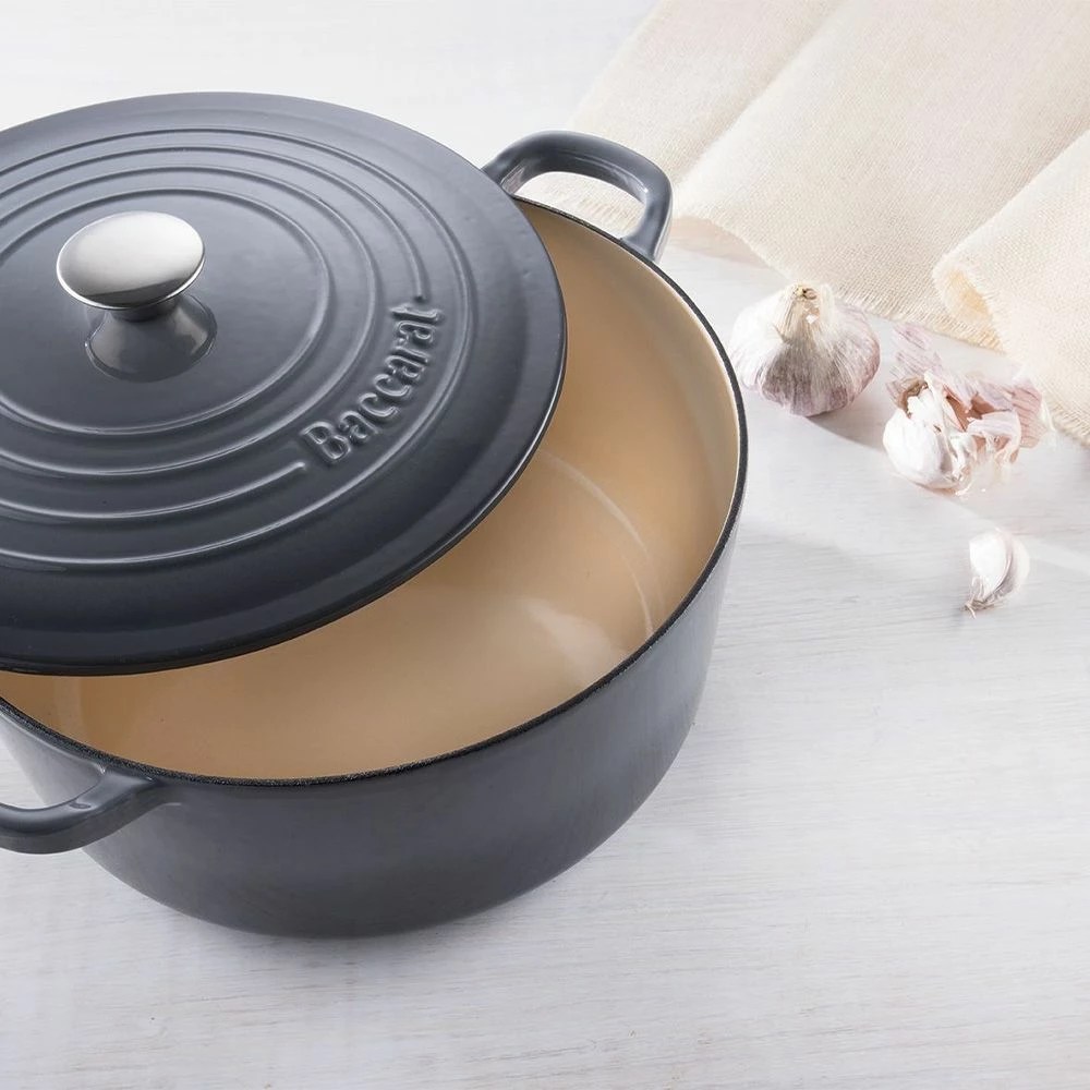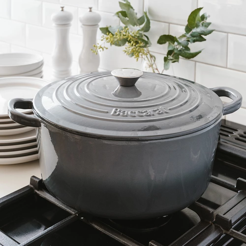 French inspired slow cooking is made easy with the Baccarat Le Connoisseur Round French Oven with Lid Grey 29cm 6.3L. The Le Connoisseur range uses cast iron due it being one of the best materials for retaining, conducting and distributing heat evenly, plus it is suitable for all cooktops including induction. The heavy thickness of the body and lid is designed to encase the heat around the food for exceptional cooking results. Le Connoisseur features generously sized handles that ensures each piece is easy to hold and carry. The Baccarat Le Connoisseur Round French Oven with Lid Grey 29cm 6.3L has been designed to be transferred directly from oven to cooktop to table. Enjoy the rustic style and brilliant cooking properties of this beautiful cast iron cookware.