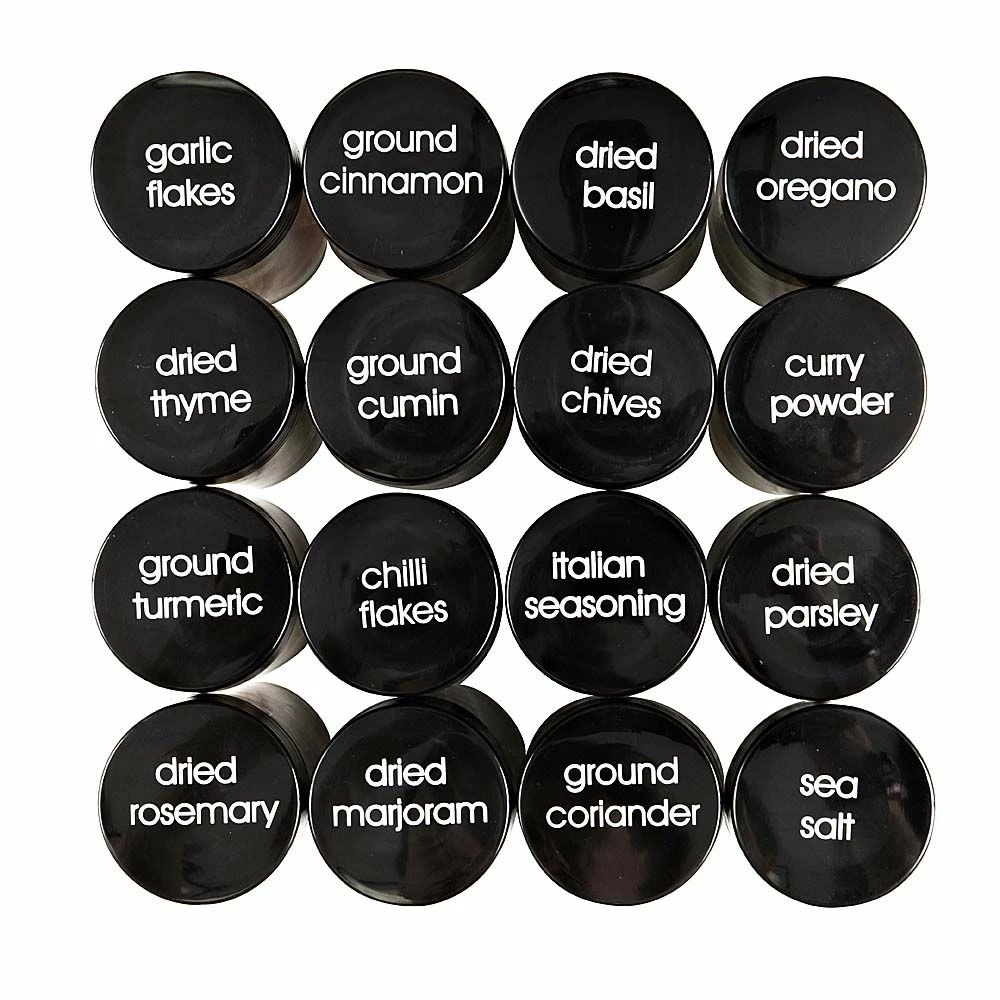 - Jars are designed with black lids labelled with each spice