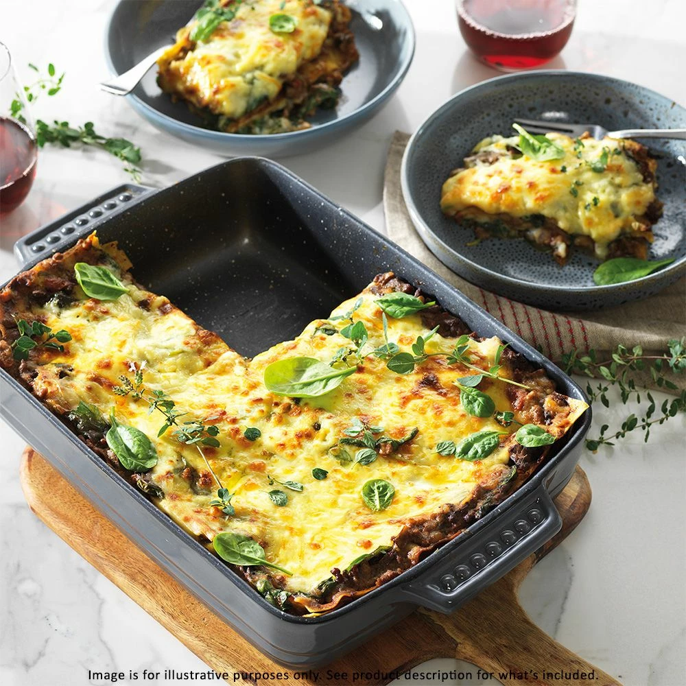 Create easy and delicious meals and desserts that your whole family will enjoy with the Baccarat Stone Bakeware! Expertly crafted, the Baccarat Stone Bakeware is the oven-to-table companion to the iconic Stone cookware range. Utilising the same premium quality stone-like non-stick interior, the Baccarat Stone Bakeware offers the same easy food release and oil-free cooking benefits Australia loves, plus a hardy stoneware exterior that is better designed for withstanding high oven temperatures. Large handles make the Baccarat Stone Bakeware easy and safe to grip, even with oven mitts and pot holders, to make serving direct from oven to table a breeze. The Baccarat Stone Bakeware also features a stylish glazed exterior that will look incredible on any table. Bake and roast all your favourite dishes for weeknight, weekend, and special event dinners, such as cobblers and crumbles, veggies and meats, pastas and lasagne