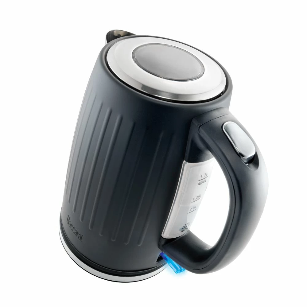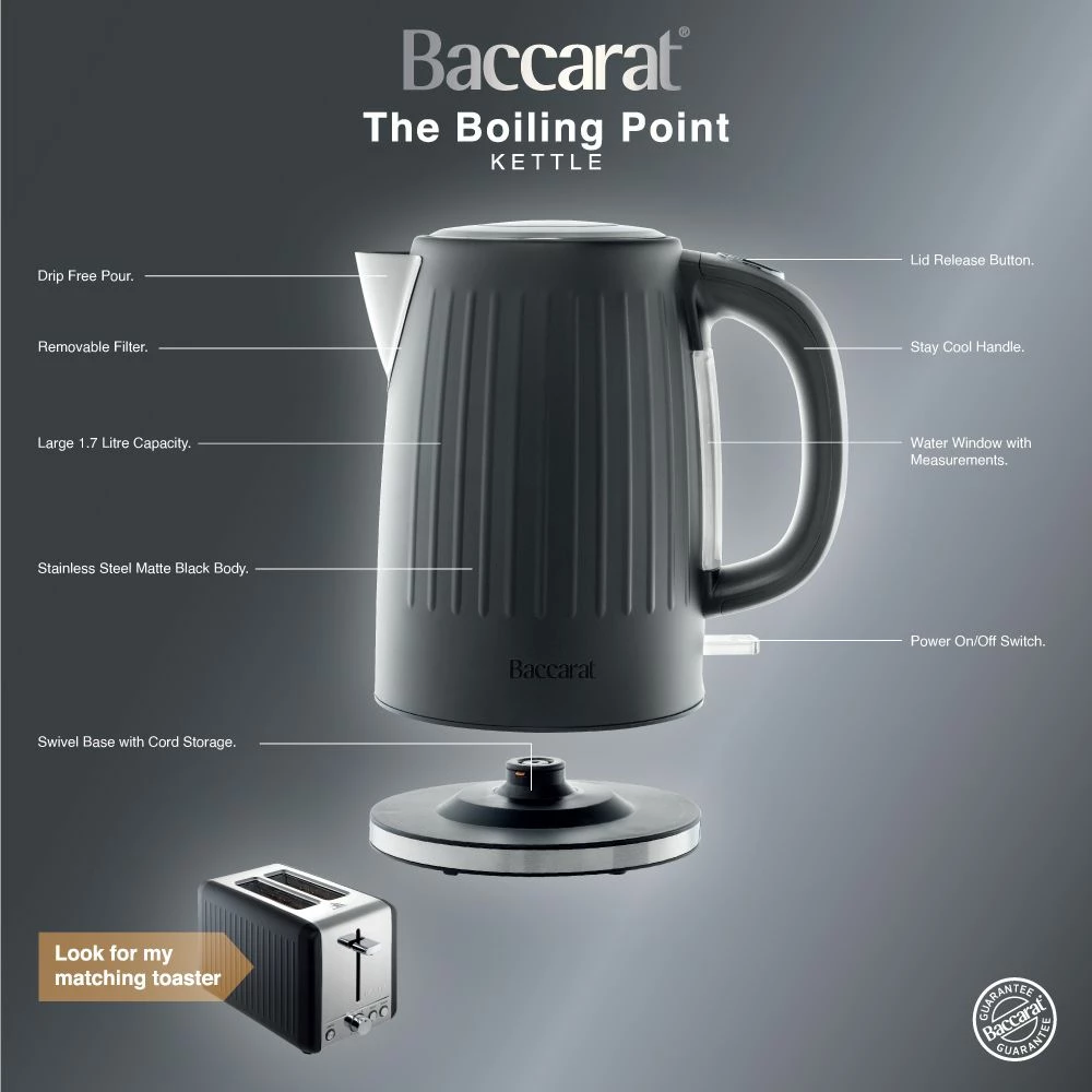 INTRODUCTORY OFFER. Add a touch of contemporary style to your morning cup of tea or coffee with The Boiling Point Kettle by Baccarat®. Designed to coordinate with today’s modern kitchens, this kettle features a sleek matte black stainless steel finish. Classic in style with the latest in features, included a water window for easy filling, safety boil dry cut off, 360-degree kettle cordless design, under base cord storage to keep your bench top neat, stay cool handles and quick release lid value for comfortable use and control. It also has a removable filter for easy cleaning. The large 1.7L filling capacity is perfect for enjoying a cup of your favourite tea or coffee blend with friends and family. Complete the look by matching The Boiling Point Kettle to The Toasty Slice 2 Slice Toaster by Baccarat®.