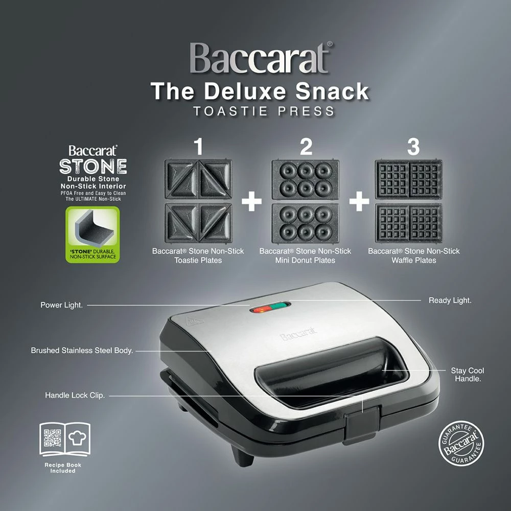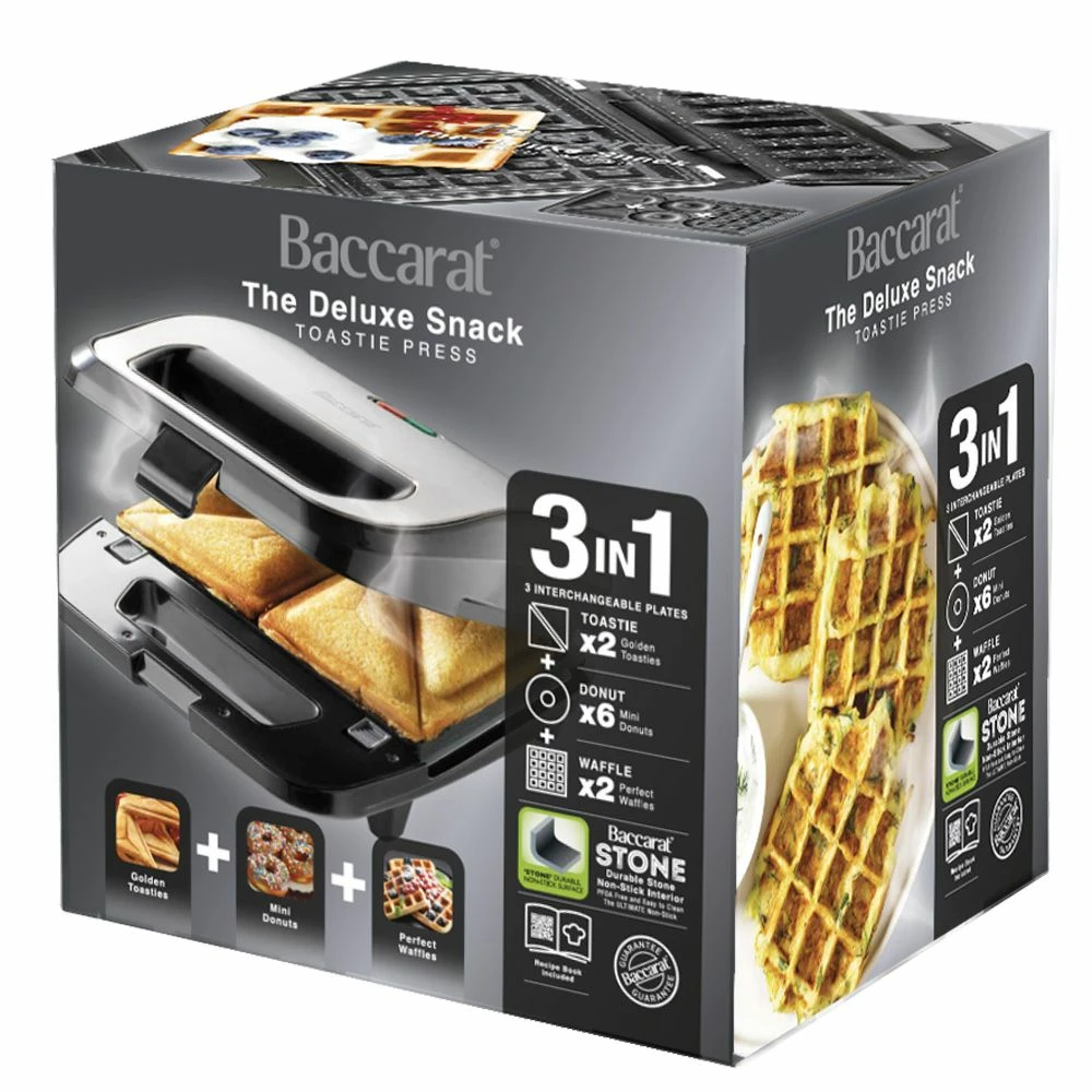 The Deluxe Snack 3 in 1 Toastie Press from Baccarat® is much more than your standard sandwich press. With the three interchangeable plates, you can create delicious toasties, waffles, or mini donuts all from the comfort of your own home. The three cooking plates are crafted from Baccarat®’s iconic STONE non-stick coating, which is environmentally friendly, PFOA pollution free and achieves delicious results every time! The non-stick interior allows for oil-free cooking while also making the plates fuss-free to clean. The body of this exceptional cookware distributes heat evenly and effectively while shortening cooking times and conserving energy. The Deluxe Snack 3 in 1 Toastie Press from Baccarat® offers a number of unique features that set it apart—and will allow you to swiftly prepare tasty and exciting snacks.