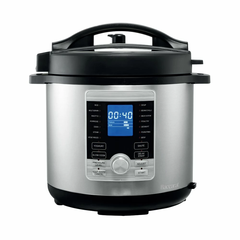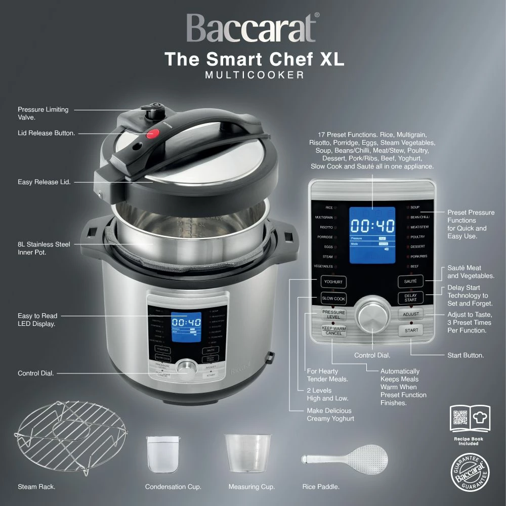 Enjoy effortless and faster cooking with the versatile and convenient The Smart Chef XL Multicooker by Baccarat®. Boasting 17 preset functions in 1 multipurpose appliance, you won’t know how you ever managed before! Cook fluffy rice to perfection, delicious curries in a flash, whip up hearty slow cooked lamb shanks and creamy Greek yoghurt with ease. Feed the entire family or meal prep for the week thanks to the generous, extra-large 8L capacity can serve up to 6-8 people. The delay start technology enables you to set and forget, so you can come home to delicious nutritious meals after a long day. The handy keep warm function ensures that dinner will always be hot, even if you are running late. Enjoy easy to use preset functions at the touch of a value including Rice, Multigrain, Soup, Porridge, Risotto, Eggs, Vegetables, Beef, Slow Cook, Sauté, Yoghurt and more! The Smart Chef XL Multicooker allows you to alter the cooking duration from 30MIN to 9.5HRS. Once the slow cook function is activated, the default time of 6 hours will appear; easily scroll the dial to alter by 30 minute increments. Includes stainless steel cooking pot, condensation cup, measuring cup, rice paddle, steam rack and bonus recipe book. Enjoy effortless cooking with the all-in-one The Smart Chef XL Multicooker by Baccarat®.
