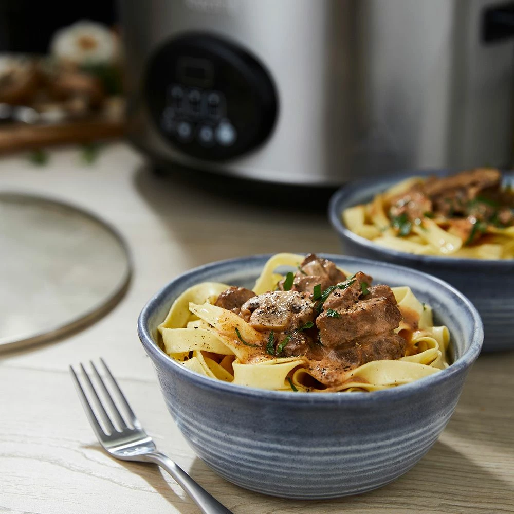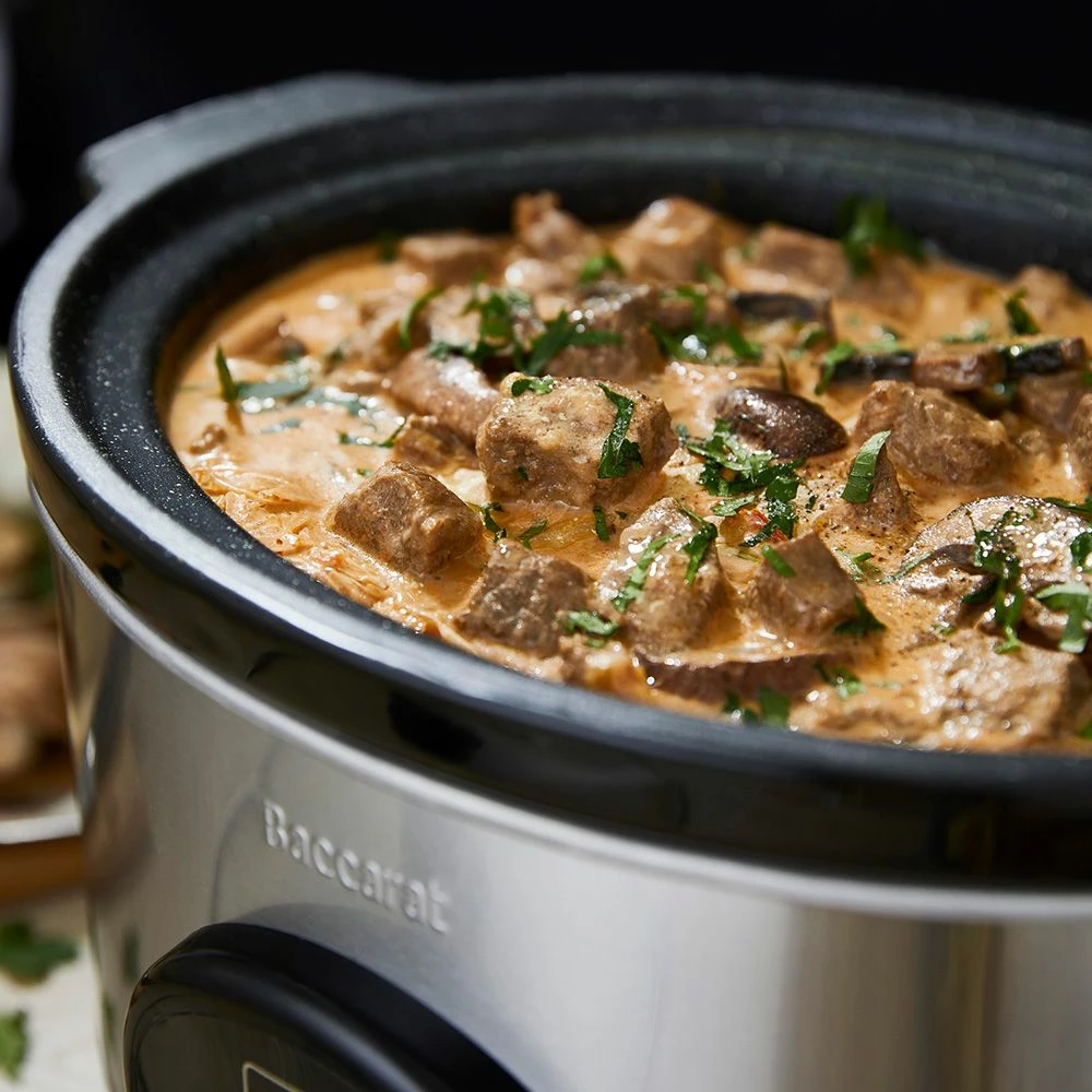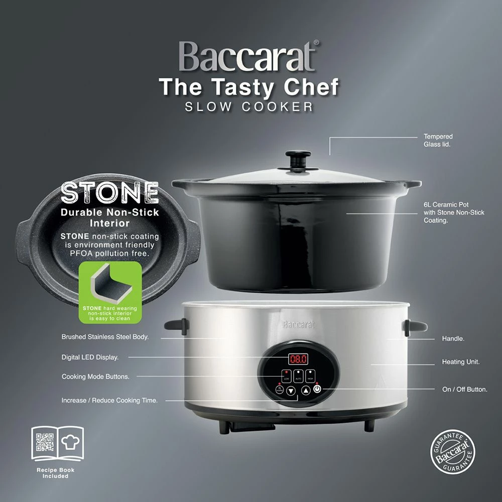 Create hearty lamb shanks or creamy pumpkin soup for the whole family with the Tasty Chef 6L Slow Cooker from Baccarat®. This amazing kitchen appliance is versatile and easy to use! Simply, combine all your ingredients in the pot at once, and in a few hours, you will have a delicious meal. The Tasty Chef 6L Slow Cooker eliminates all the hassle of cooking while retaining the moisture that enhances natural oils and flavours. This slow cooker was designed with ease in mind; it can be easily carried from the heating unit to your table and serve up to 4-6 people thanks to its large 6L capacity. The Tasty Chef 6L Slow Cooker boasts a removable ceramic pot with a STONE non-stick interior, ensuring this slow cooker is durable and hardwearing. Cook at high heat or low heat, and if dinner is ready but you’re not, just switch the Baccarat® Tasty Chef 6L Slow Cooker to the handy keep warm mode, so it stays nice and hot without overcooking.Â